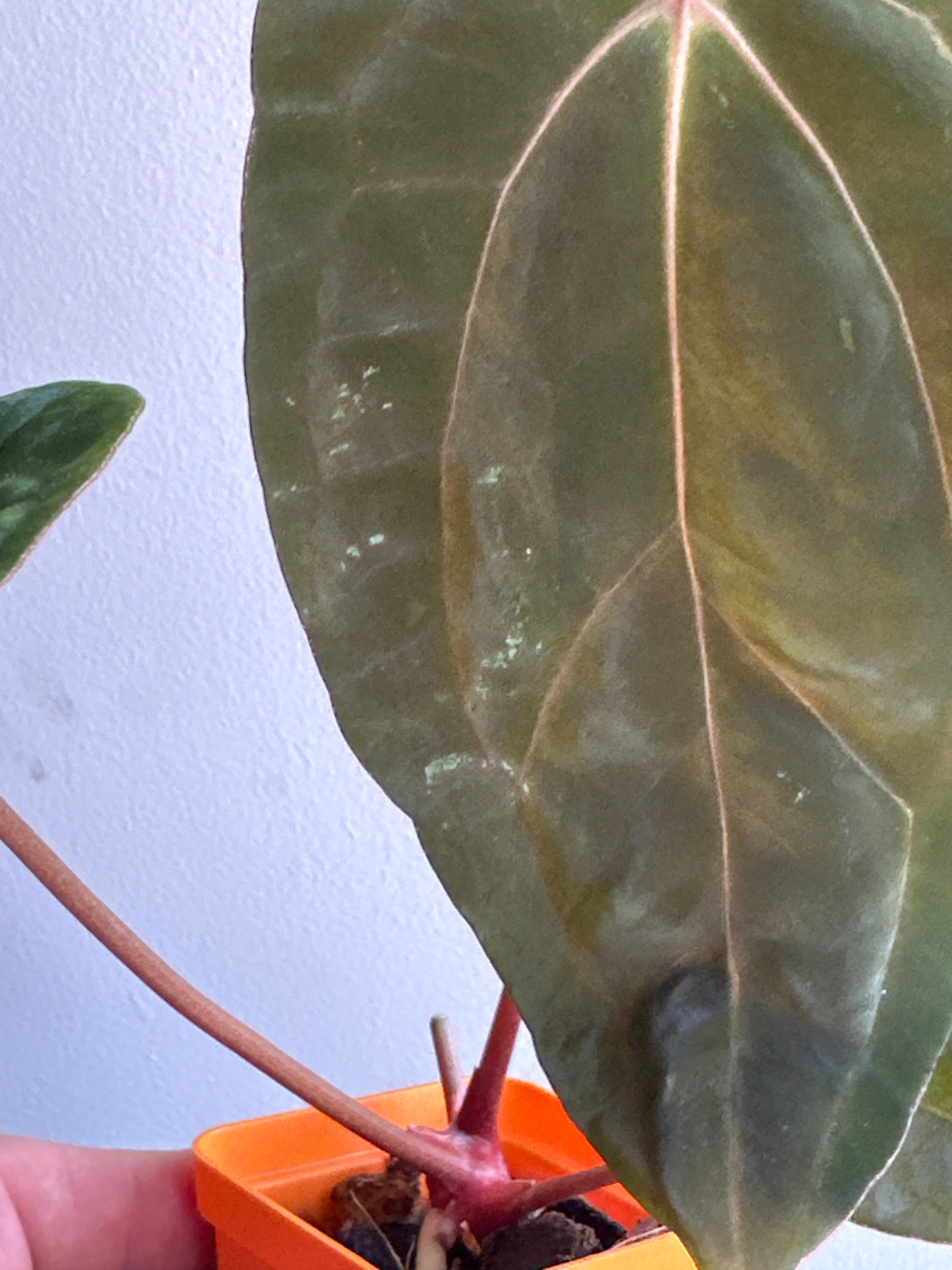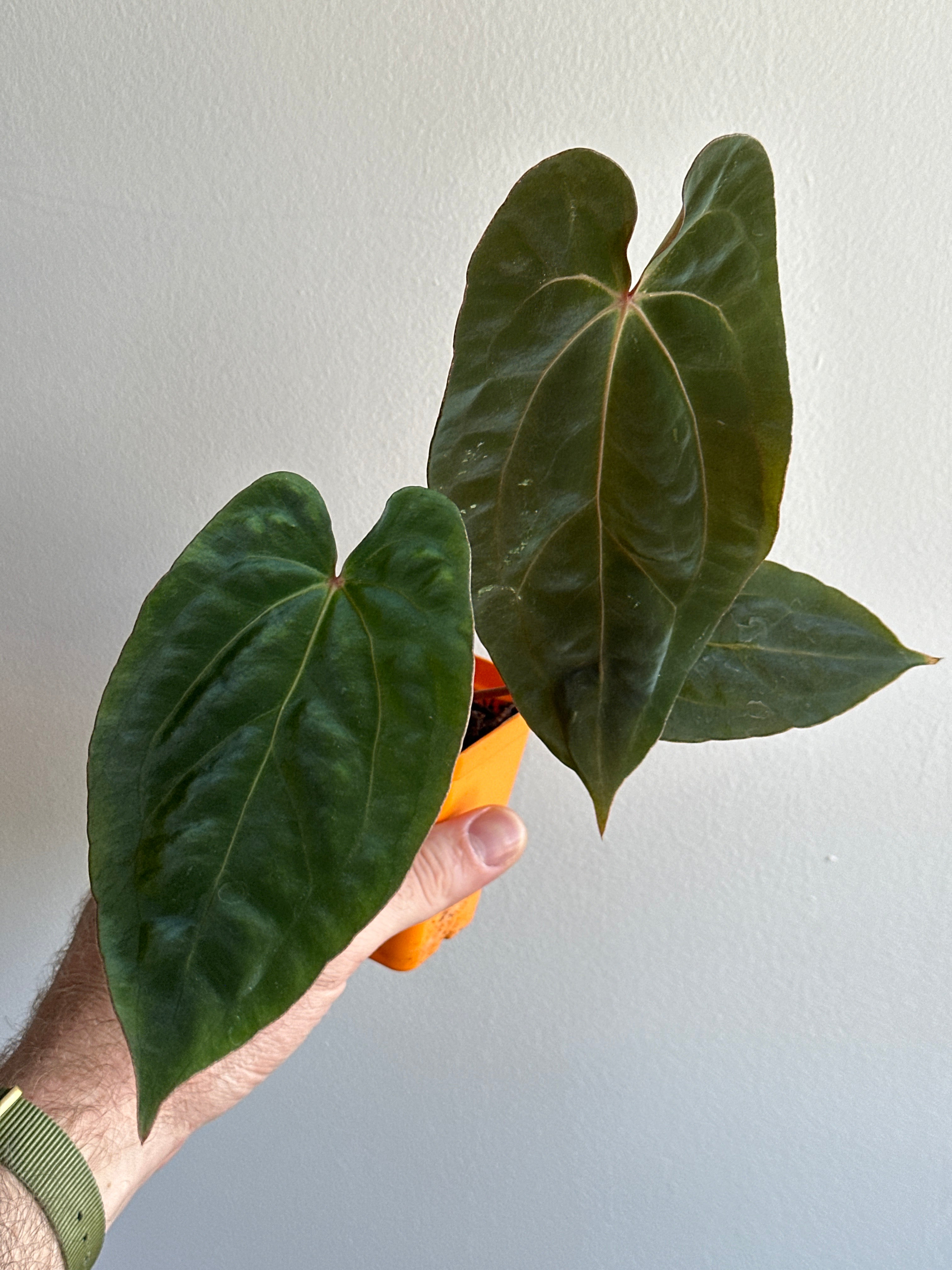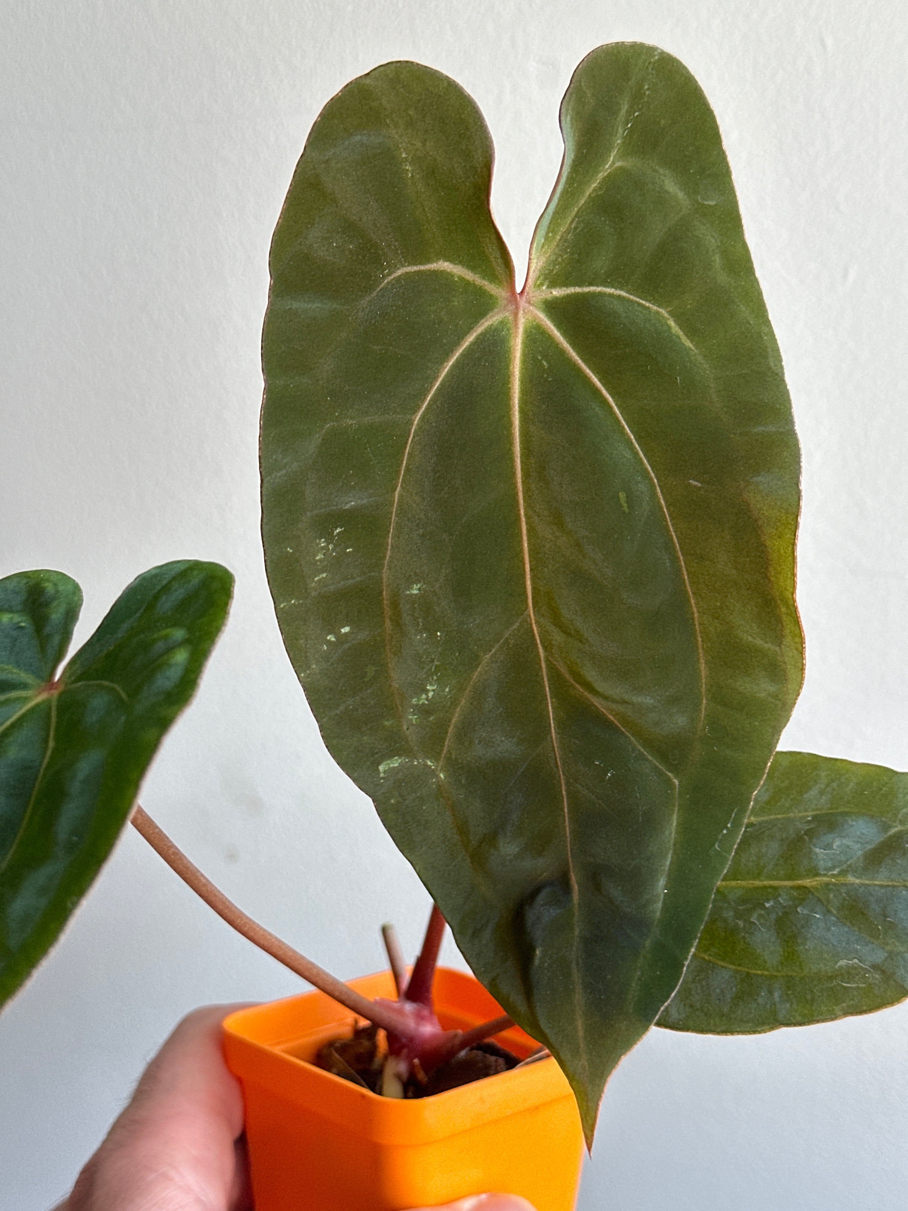 ‘Carlos’ (carla x pap 'RL’) The parent characteristics are showing through. It has dark velvet leaves with pink emergent veins that fade to a light pink when hardened. Many of the hybrids from this mother have pink to purple veins with the same dark velvet foliage.