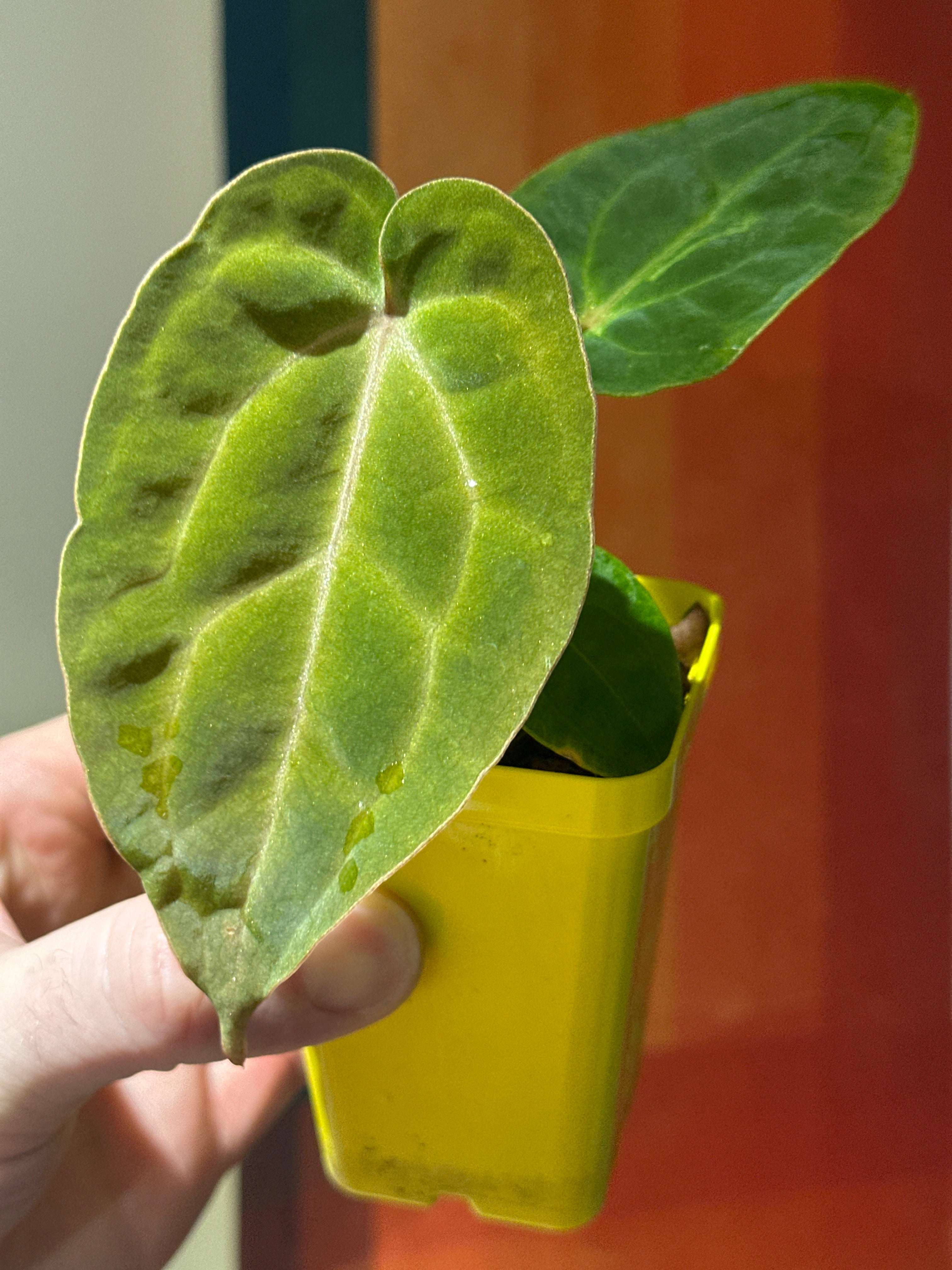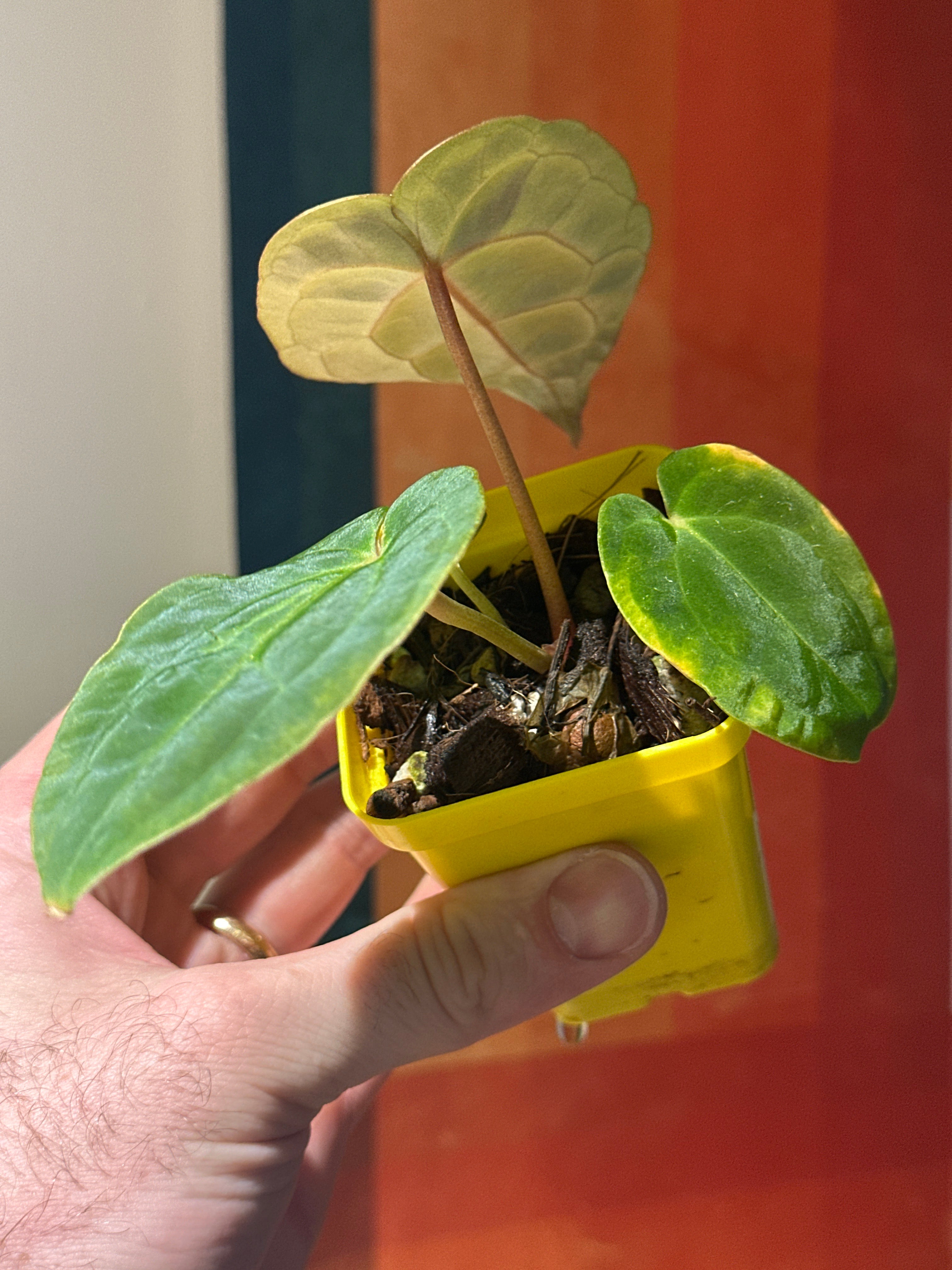 ‘Carlos’ (carla x pap 'RL’) The parent characteristics are showing through. It has dark velvet leaves with pink emergent veins that fade to a light pink when hardened. Many of the hybrids from this mother have pink to purple veins with the same dark velvet foliage.